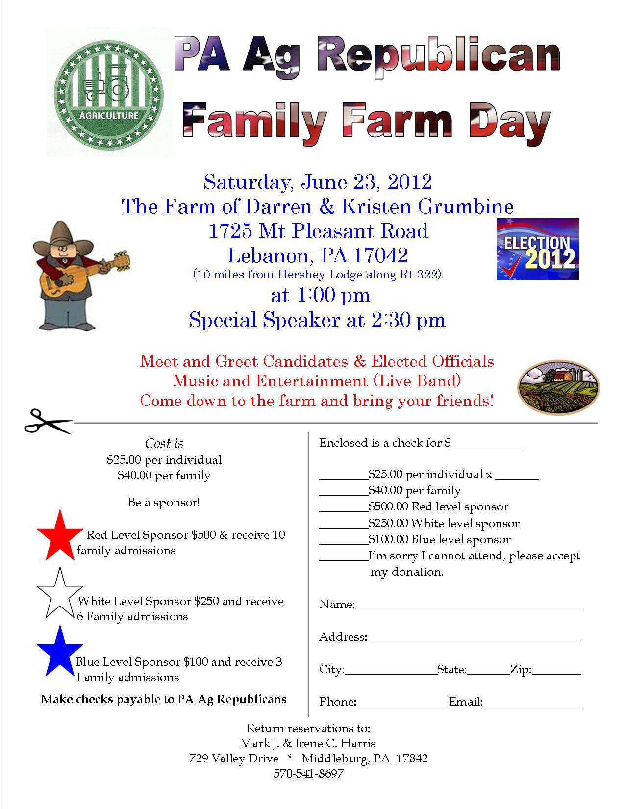 Pennsylvania Ag Republican announce they are hosting a family farm day on Saturday, June 23, 2012. This event is family friendly and all ages are encouraged to attend. The event begins at 1:00 pm with lunch being served followed by a special speaker at 2:30 pm. There will be a live band playing as attendees meet and greet candidates seeking office or while talking your representatives already elected to office.