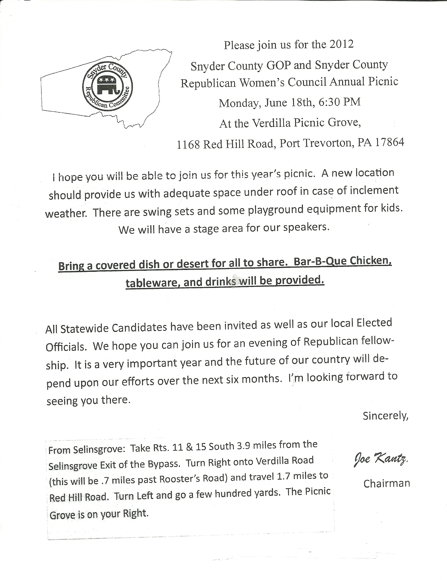 Snyder County GOP Picnic – June 18, 2012 Share this: Click to share on Facebook (Opens in new window) Facebook Like Loading... Related