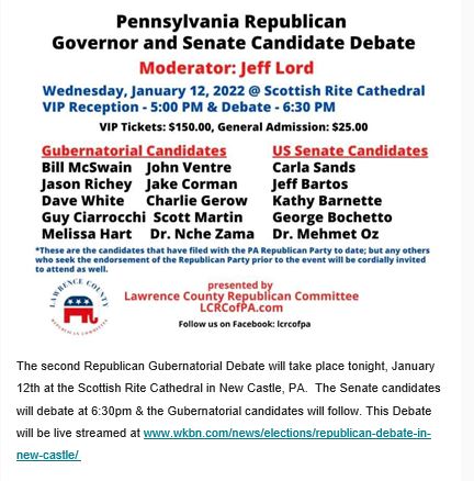 PA Gov & US Senate Debate tonight 1/12/2022 livestream at 6:30 pm www.wkbn.com/news/elections/republican-debate-in-new-castle/ Share this: Click to share on Facebook (Opens in new window) Facebook Like Loading... Related