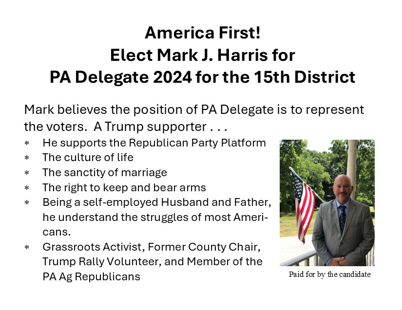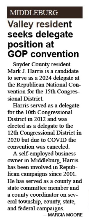 In case you missed the 3/13/2024 Sunbury Daily Item . . . vote Mark J. Harris for Delegate of the 15th Congressional District for Delegate