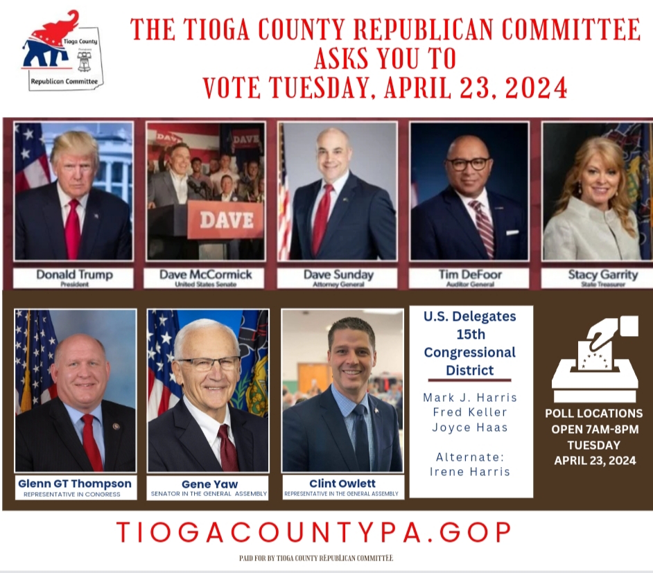 Vote Mark J. Harris, Delegate to the RNC for the 15th District. Thank you Tioga County GOP for your support!