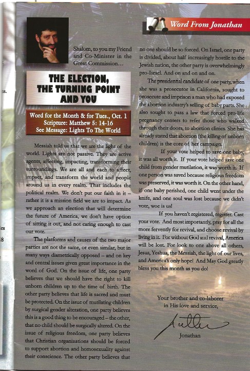 “If your vote helped to save one baby, it was all worth it. If your vote helped save one child from gender mutilation, it was worth it. If one person was saved because religious freedom was preserved, it was worth it. One the other hand, if one baby perished, one child went under the knife, and one soul was lost because we did not vote, woe is us! ~ Jonathan Cahn